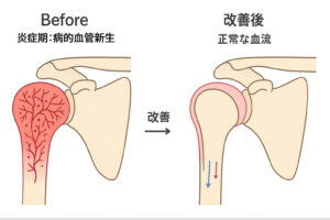 鍼治療による四十肩・五十肩の血流正常化のイメージ図:炎症期の病的血管新生から正常な血流へ